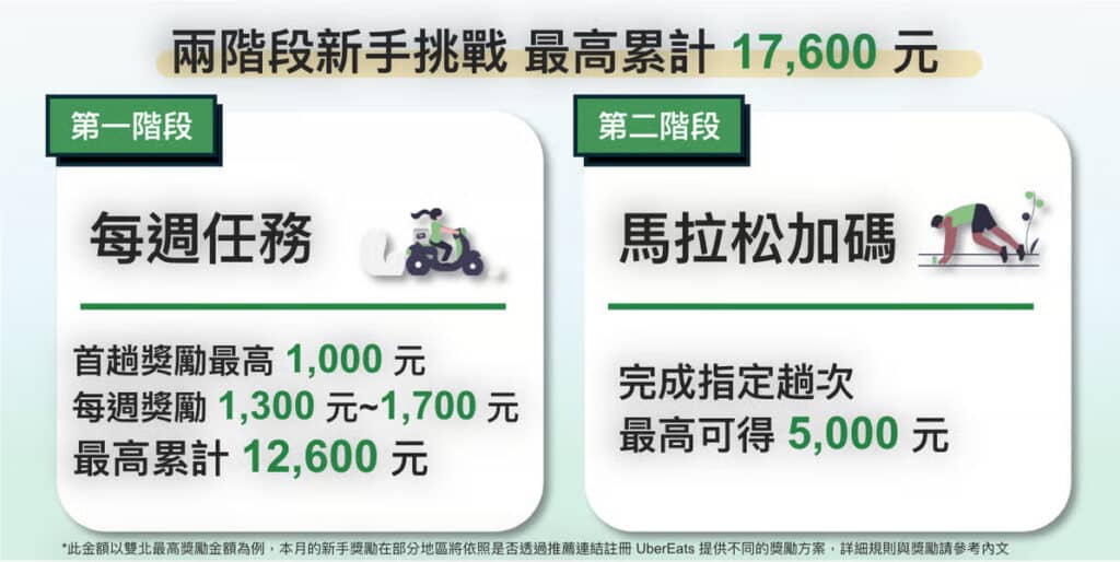 只要在2026/01/01– 2026/01/31 期間,首次註冊外送合作夥伴帳號,並於 30 天內完成開通,即可參與兩階段新手專屬挑戰!