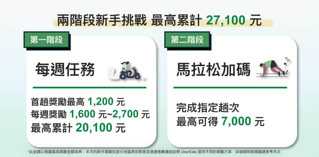 只要在2026/04/01– 2026/04/30 期間,首次註冊外送合作夥伴帳號,並於 30 天內完成開通,即可參與兩階段新手專屬挑戰!